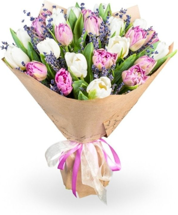 Этот трогательный букет из божественно прекрасных белых и розовых тюльпанов и чарующе ароматной лаванды станет вашим великолепным выбором в качестве подарка дорогому для вас человеку. Лаванда и тюльпаны не только прекрасны, но ещё символизируют собой долголетие, душевное равновесие и счастье, вашу защиту и покровительство, и конечно, вашу любовь.